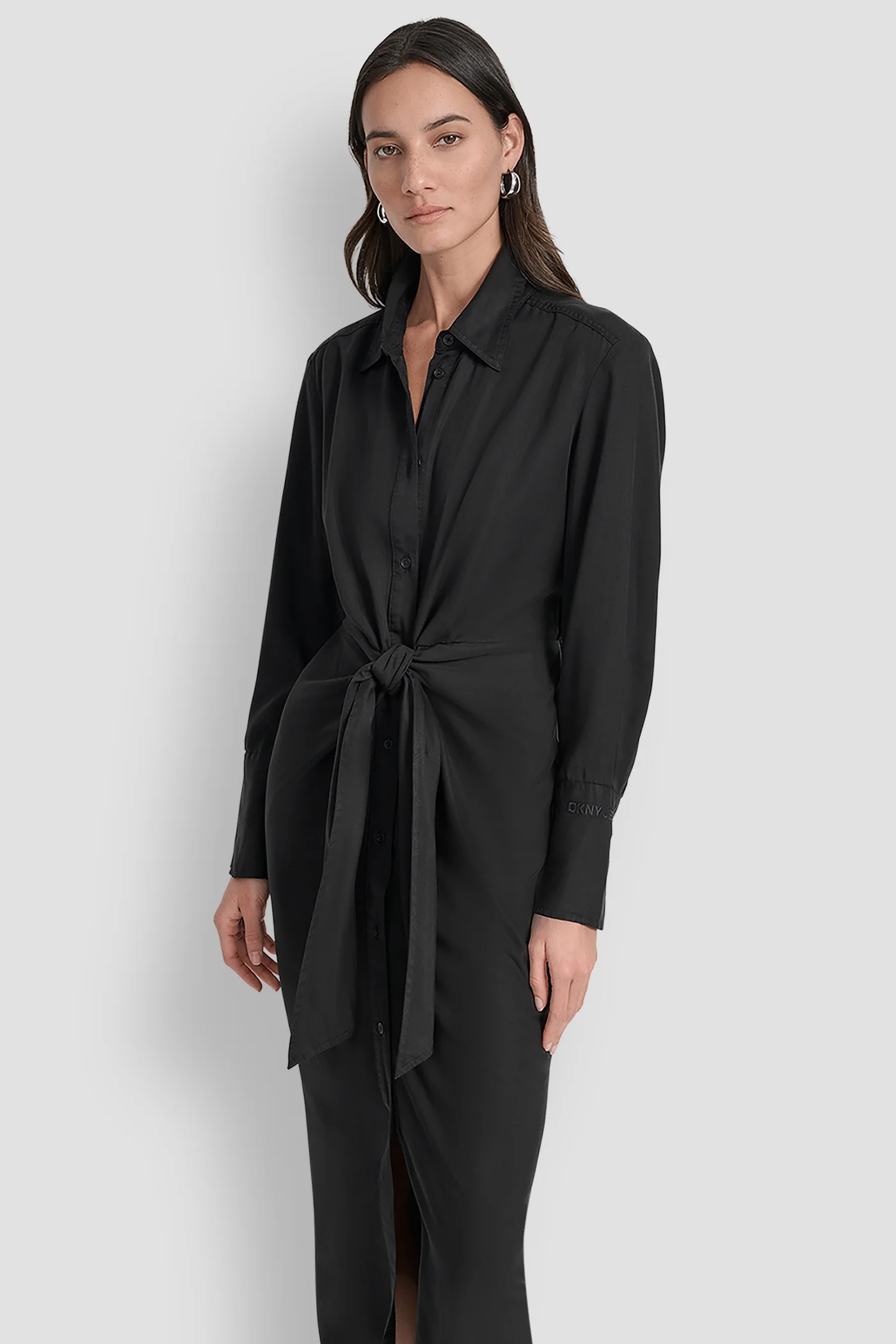 - Button-front closure with collared neckline and self-tie at waist