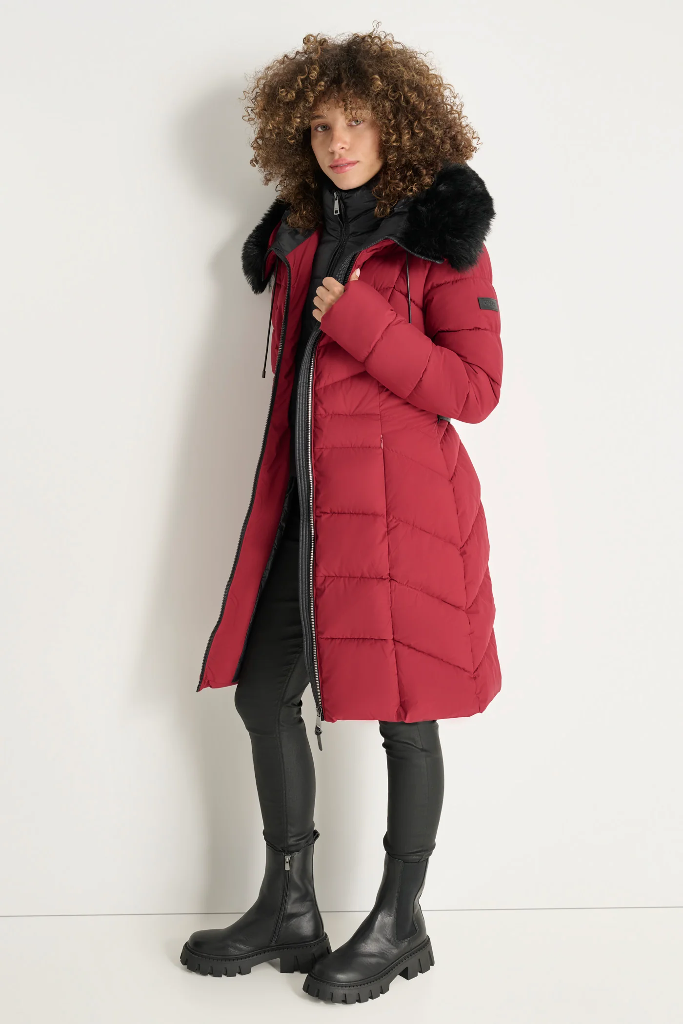- Removable zip-off hood with faux-fur trim and drawstrings; front zip closure